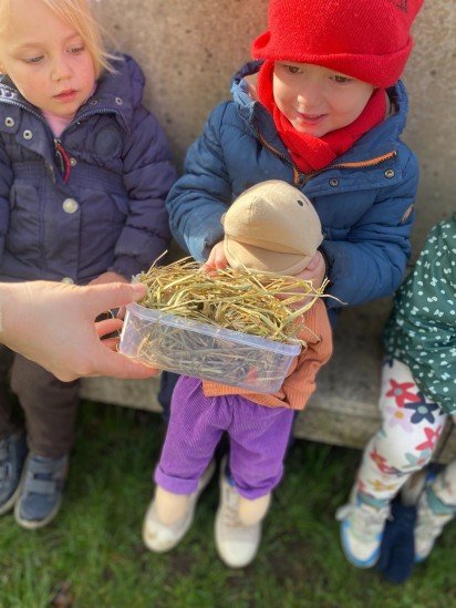 De kinderen mochten Roosje van dichtbij bekijken en zelfs voelen en ruiken aan alles wat bij een pony hoort. We ontdekten hoe zacht een borstel aanvoelt, roken aan het hooi dat Roosje graag eet en zagen speciale appelsnoepjes die helemaal gemaakt zijn voor pony's.